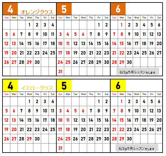 HOME > グーピィーブログ > カレンダー > カレンダー レッスンカレンダー※2026.4.9更新 2026-04-09 2026.4月~2026.6月:Kids 2026.4月~2026.6月:J・H・A Twitter Share Pocket Hatena LINE URLコピー -カレンダー